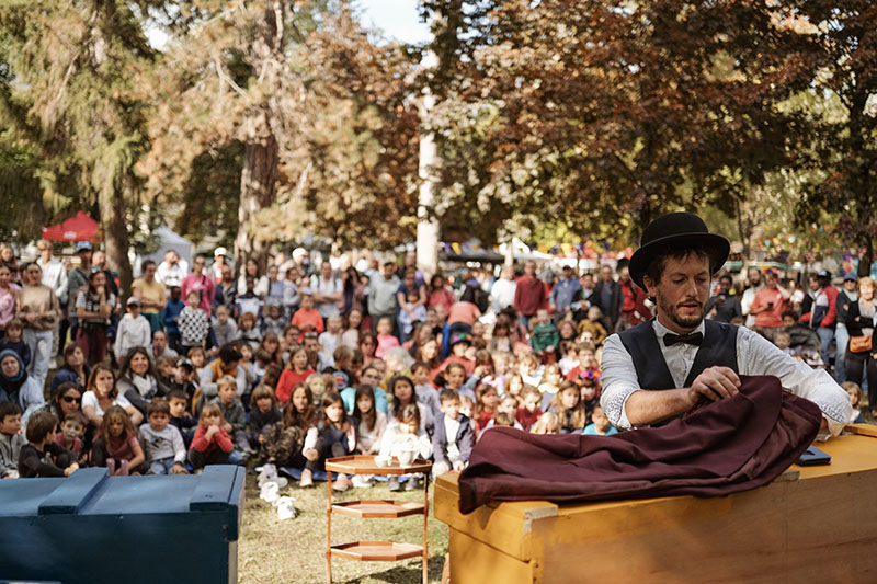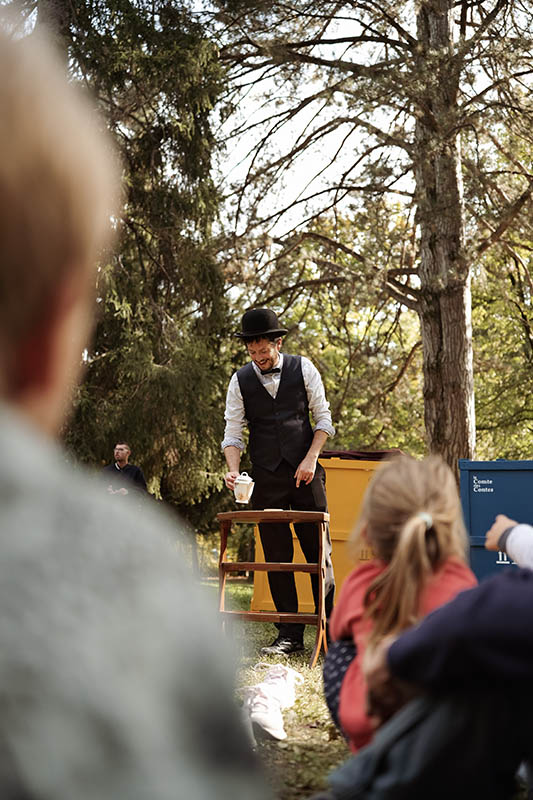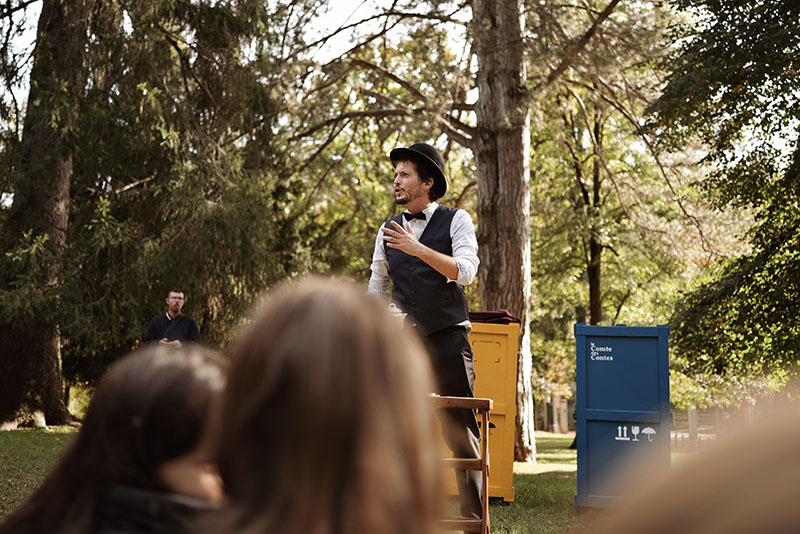 Ce personnage un brin original aime partager sa passion aux petits comme aux grands. Pour cela il se déplace avec deux malles contenant une sélection d’objets que le public pourra choisir. A chaque objet son histoire.